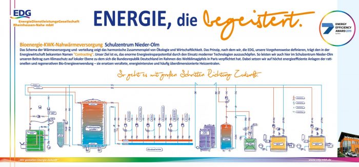Das Gewinner-Konzept gibt wichtige Impulse für die Energiewende im kommunalen Bereich: Das Projekt „Energieeffizienzcluster Schulzentrum Nieder-Olm“ wurde von der EDG als Contractor gemeinsam mit dem Landkreis Mainz-Bingen und dessen Klimaschutzmanager im vergangenen Jahr umgesetzt. Das Ziel war, das Schulzentrum mittels Contracting auf Erneuerbare Energie umzustellen.