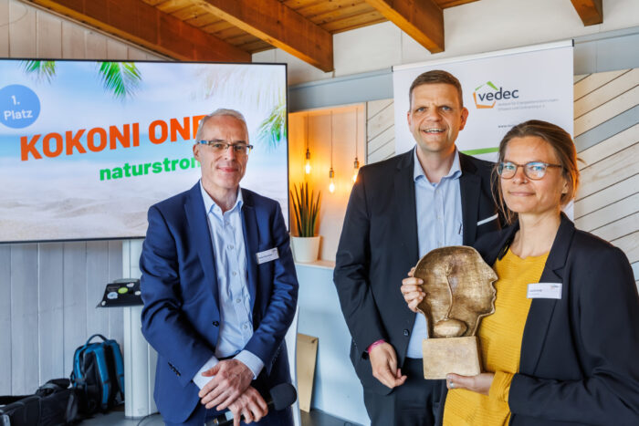 Stefan Sagmeister von der Fachzeitschrift Energie & Management und Tobias Dworschak, Vorstandsvorsitzender des vedec übergaben im Rahmen unserer Sommerparty den begehrten Preis. Lea Schmid nahm den Preis stellvertretend für die naturstrom AG mit Freude entgegen.