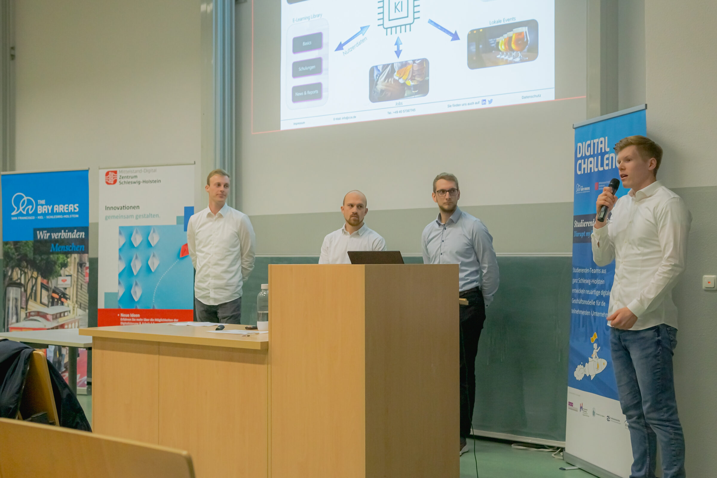 Die Digital Challenge 2022 endete Freitagabend (04.11.2022) in Kiel mit einem spannenden und innovationsgeladenen Finale. Über siebzig Studierende, Lehrkräfte und Vertreter:innen der teilnehmenden Unternehmen sowie Unterstützer:innen des Projekts haben an der Abschlussveranstaltung und Preisverleihung teilgenommen.