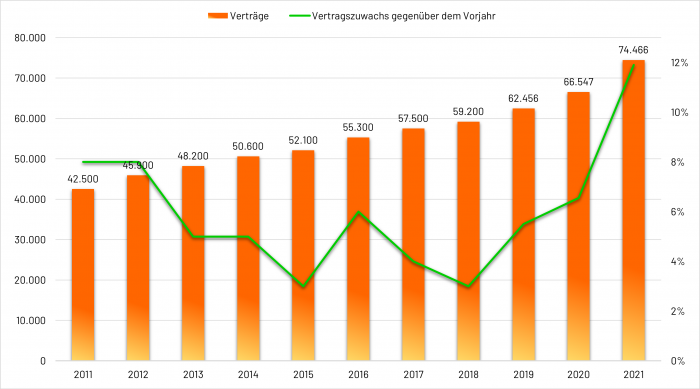 Mit einer Umsatzsteigerung von 10,9 % und einem Vertragszuwachs von sogar 11,9 % im Vergleich zum Vorjahr identifiziert die Markterhebung ein erneutes Branchenwachstum für das Jahr 2021.
